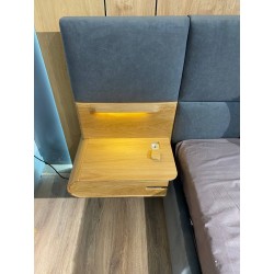 Comfortable and extremely stylish bed made of natural oak and ash (inner frame), with a large soft headboard and stylized drawers with a sunken facade and accentuated chamfer.